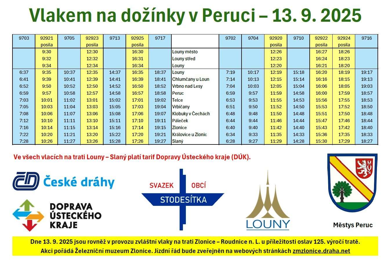 Kromě našich vlaků zajištěných dopravcem Lokálka group a navazujícího Podřipského motoráčku KŽC vás na trati Slaný – Louny čekají dožínkové vlaky svazku STODESÍTKA.