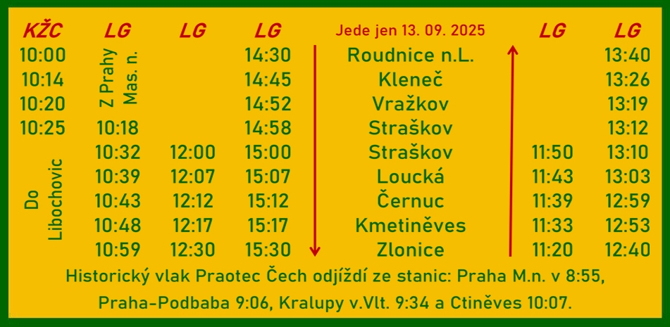 Nabízí přímý vlak Praotec Čech z Prahy Masarykova nádraží přes Podbabu a Kralupy do Zlonic, jeho setkání s Podřipským mororáčkem ve Straškově (přestup ve směru od Roudnice do Zlonic), polední jízdu Zlonice – Straškov a zpět a odpolední jízdu Zlonice – Roudnice a zpět.
